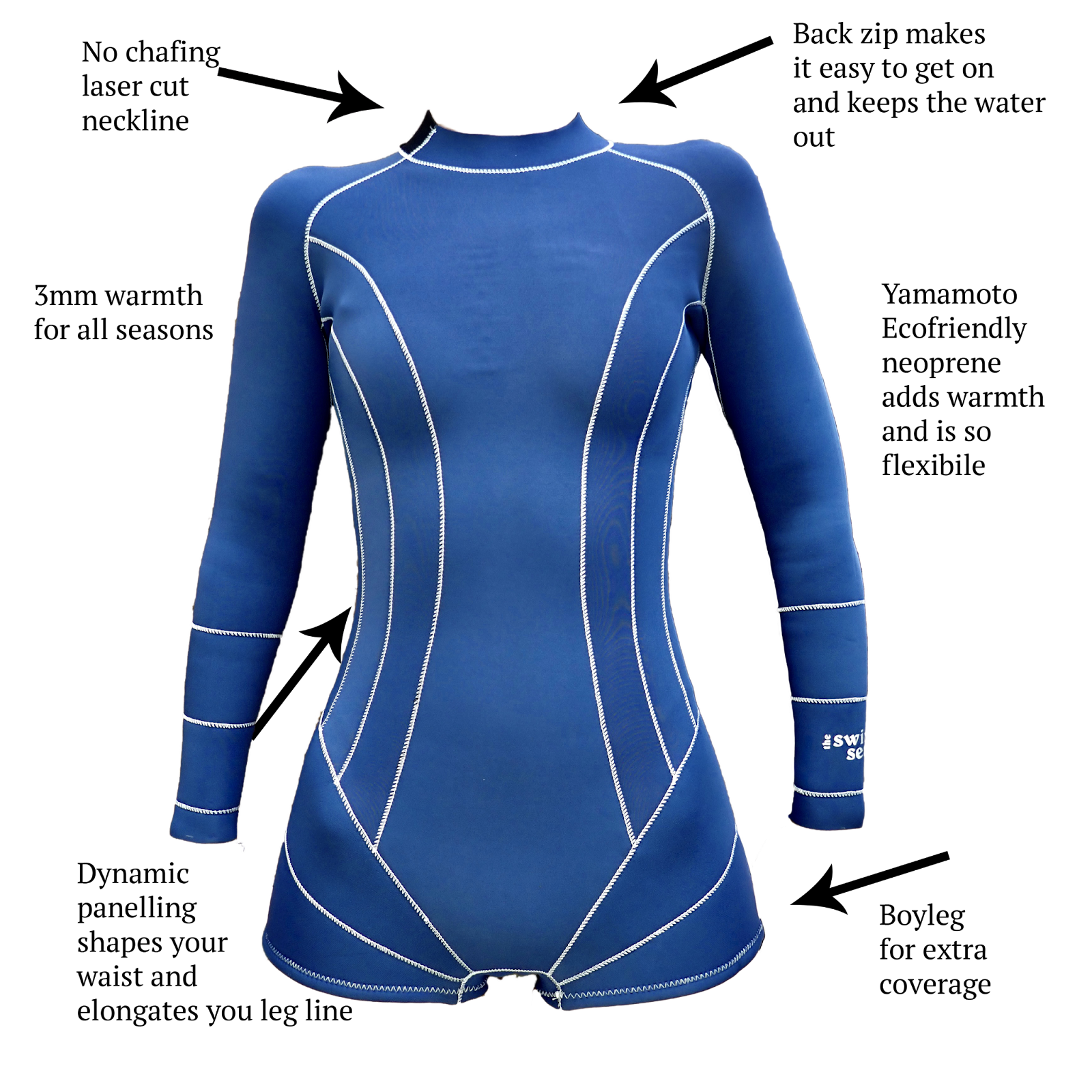 A super flattering long sleeve, short leg wetsuit designed in Australia for women who want to look good wearing their wetsuit daily.