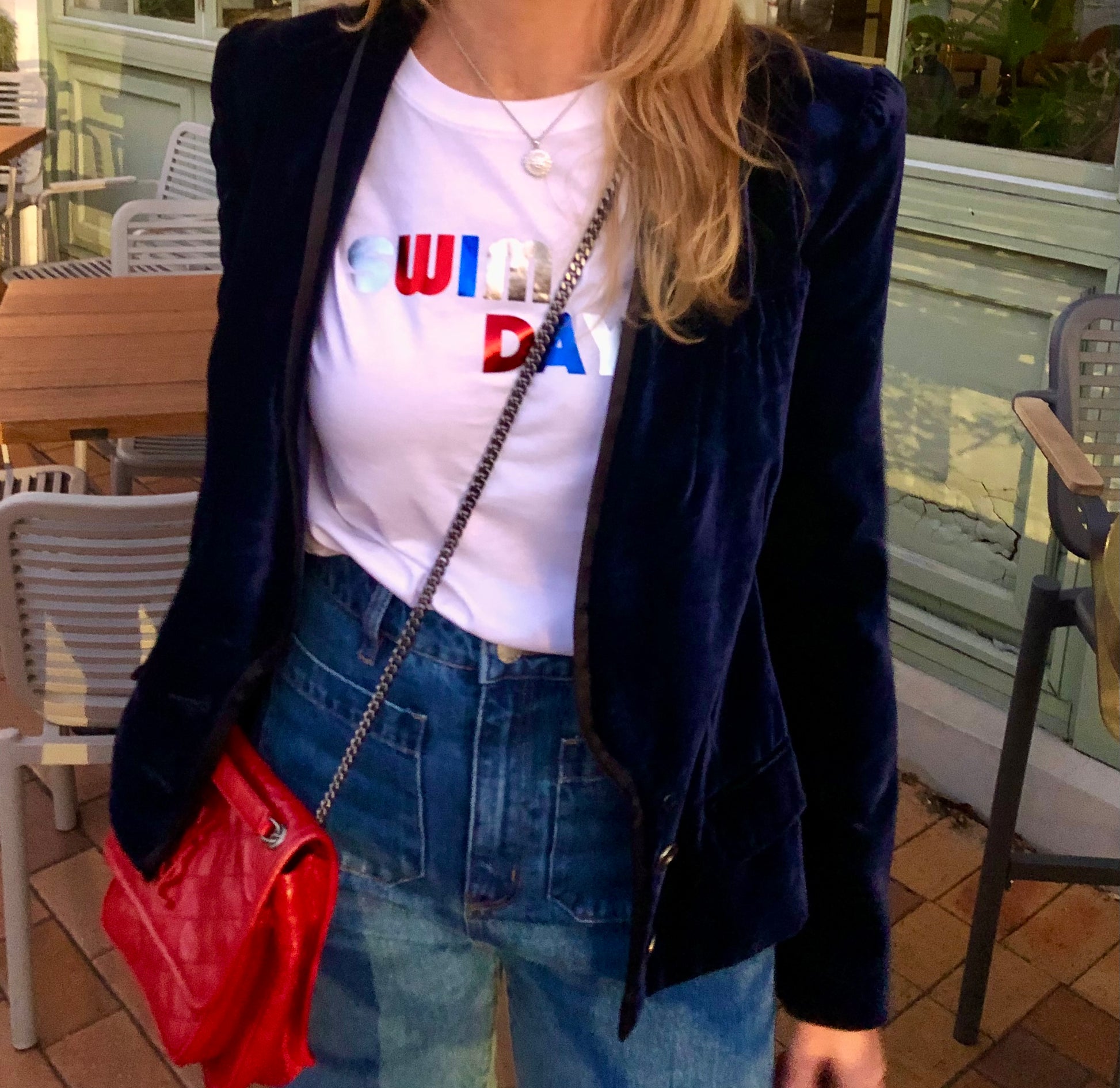 Stylish + chic. Featuring the “you never regret a swim” custom print.