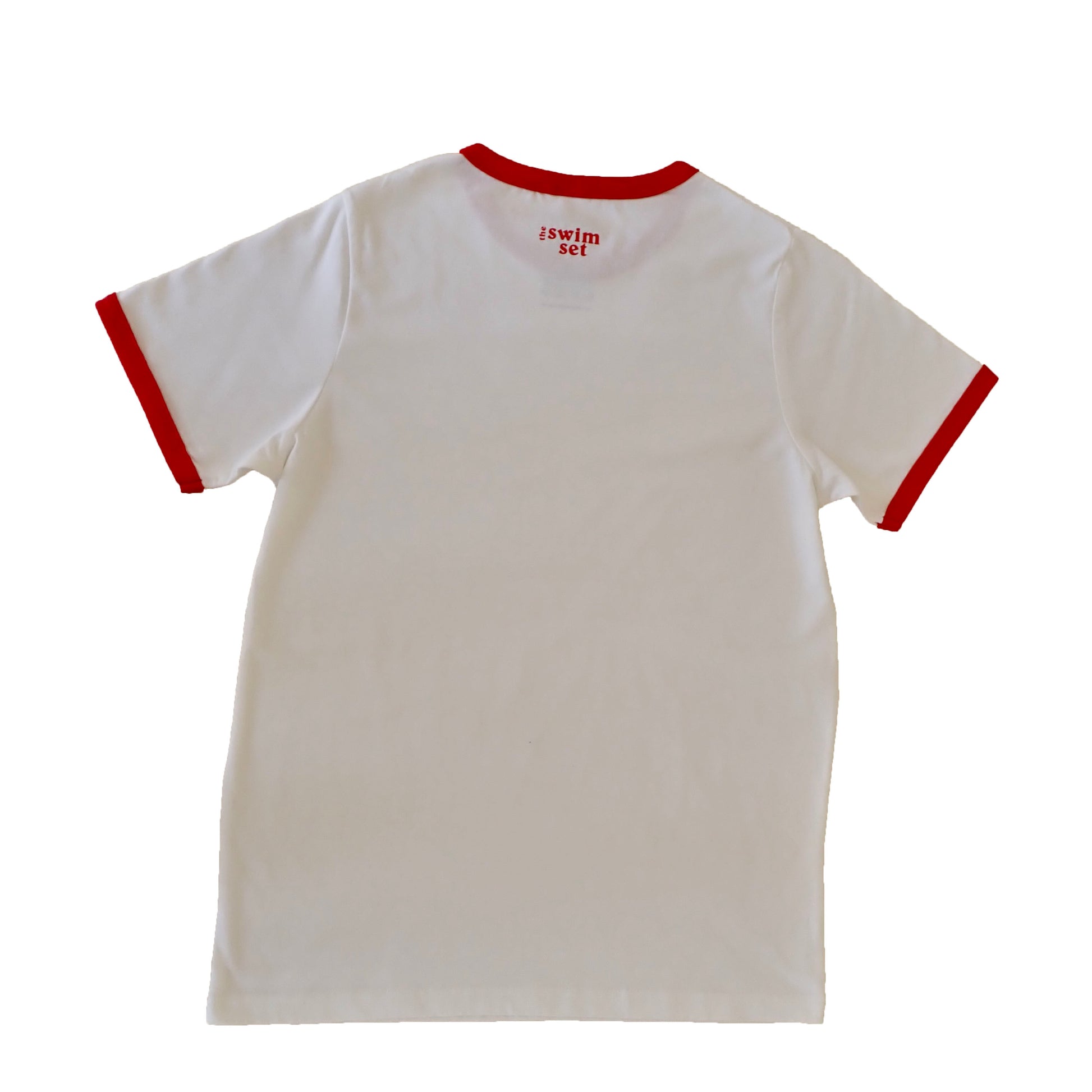 White t-shirt with Trim in Red on the neckline and sleeve Retro diver and "You never regret a swim print"