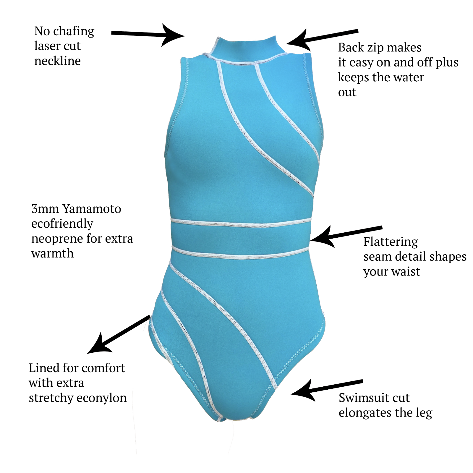 Designed in Australia. For women by women. A super stylish sleeveless wetsuit. For women who want to look good, wearing their wetsuit daily.