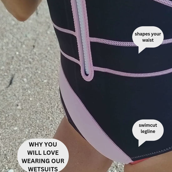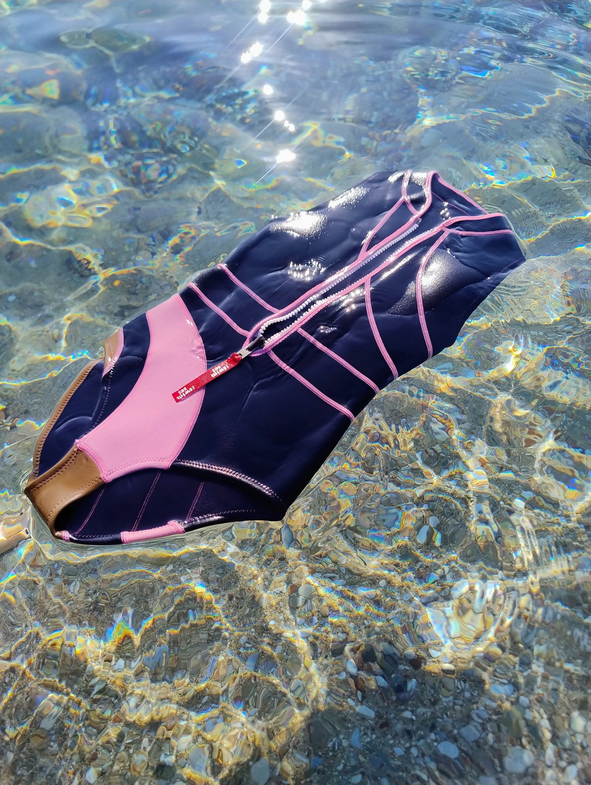 Introducing Gigi – our sleeveless front zip wetsuit. Provides easy entry, is streamlined and is designed to match your every stroke, dive and glide. Its striking panelling and pink stitching speaks to individuality and bold stylishness.