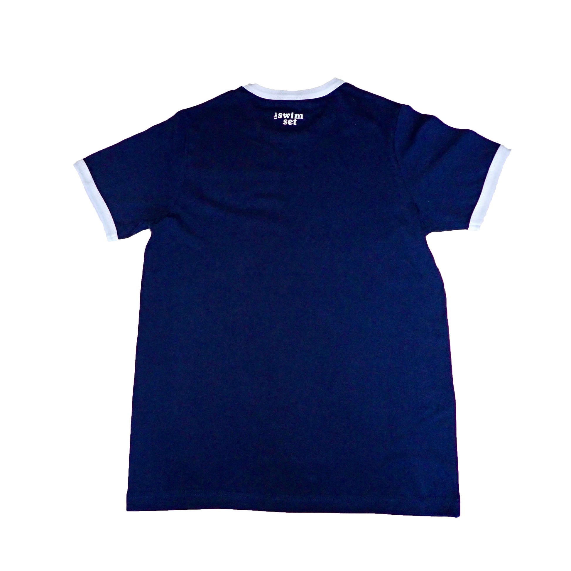 Navy t-shirt with white trim detail on neckline and sleeve Retro vintage diver "You never regret a swim print"