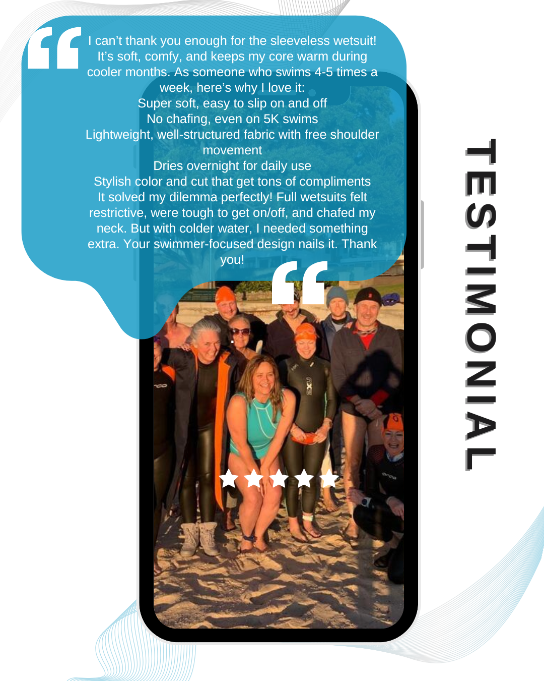 It solved my dilemma perfectly! Full wetsuits felt restrictive, were tough to get on/off, and chafed my neck. But with colder water, I needed something extra. Your swimmer-focused design nails it. Thank you!